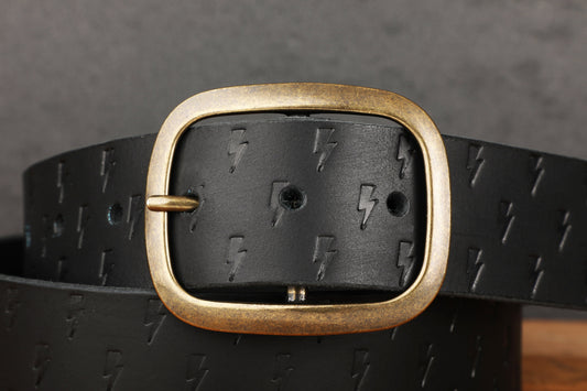 Black Leather Belt with Embossed Lightning Bolts and Antique Brass Buckle
