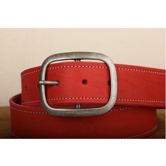 Red Leather Belt with White Stitch and Antique Silver Buckle
